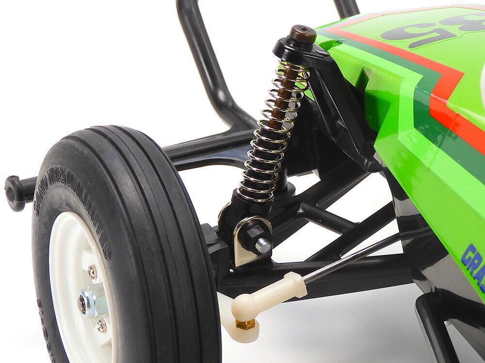 シンプルでタフな組み立てやすい車体構造がグラスホッパーの特徴です。ABS樹脂製のボックスタイプフレームにボディをビス止めして一体化。強度が高く軽量なモノコック構造を採用しました。サスペンションはフロント・スイングアクスル独立、リヤ・リジッドのコイルスプリング付き。悪路でも元気な走りを披露します。ギヤボックスはオフロードにつきものの砂や小石の侵入を防ぐ信頼性の高い密閉式。スムーズなコーナリングを生み出すデフギヤを内蔵しました。また立体感あるデザインの前後ホイールは組み立て式の3ピースタイプ。前輪は方向性に優れたグルーブドタイヤ、後輪は十分なグリップ力を発揮するパドルタイヤを装着しました。