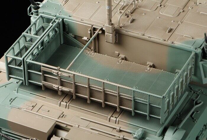 【 徹底した実車取材により音と光、動きまでもリアル再現 】 2010年に制式採用された陸上自衛隊の10式(ひとまるしき)戦車を1/16スケールで再現した電動ラジオコントロールタンクの組み立てキットです。陸上自衛隊の全面協力により徹底した実車取材を行い、120mm滑腔砲や傾斜した装甲を持つスリムな車体をリアルにモデル化。現用戦車らしいパワフルでスムーズな前後進や左右旋回をはじめ、砲塔旋回や砲身上下もコントロールでき、射撃時の砲身後座や車体反動まで再現しました。実車から収録したエンジン音や主砲発射音など、それぞれの動きにサウンドが同調。主砲と連装銃は発射光も連動します。さらに、走行中の車体の姿勢や砲塔の向きを感知して、砲身の上下と砲塔の左右の動きを自動的に調整する砲身制御システムを搭載。送信機であらかじめ設定した方向に対して常に砲身を向け続けて走行できます。また、砲身は専用サーボの制御により、発砲後に装填角に戻り、砲塔を後方に向けた際の砲身の車体回避動作も自動的に行います。別売の バトルシステム も搭載可能。