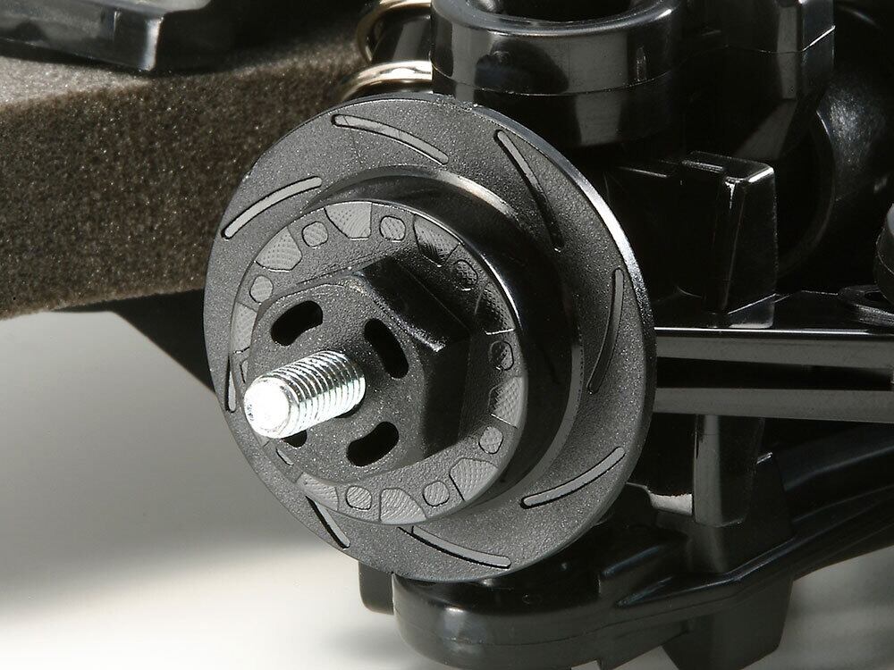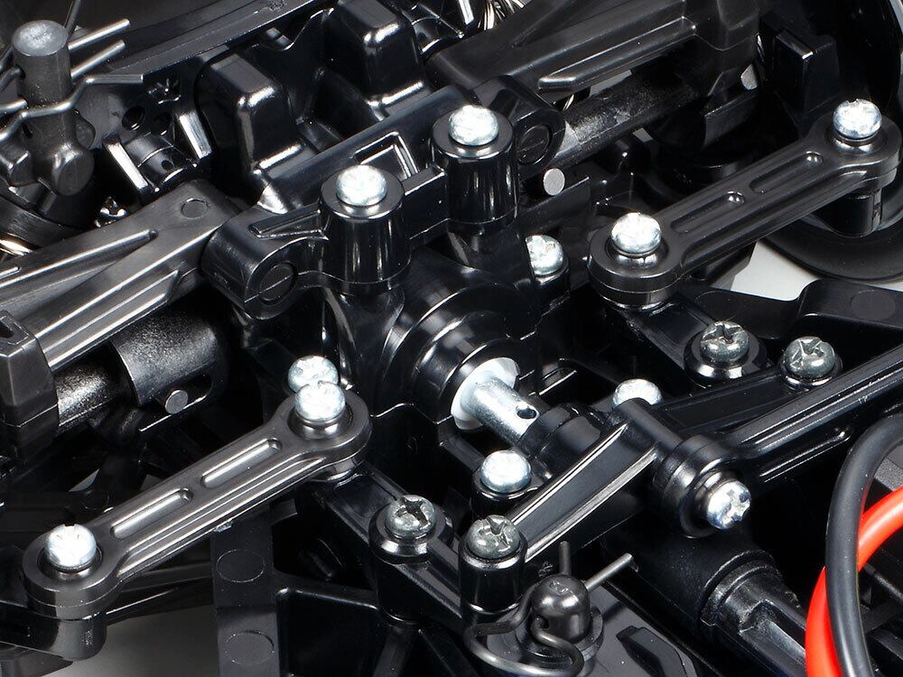 【 操縦性に優れセッティングも楽しいシャフトドライブ4WD、TT-02シャーシを採用 】 シャーシはシャフトドライブ4WDのTT-02。走行用バッテリーを左、モーターを右に縦置きにレイアウトした好バランス設計により操縦安定性に優れ、サスアームやアップライトを左右共通化して組み立てやすく、上下分割式のギヤケースなどにより整備性も高い構成となっています。さらに、パーツの組み換えなどによりホイールベース、車高、トレッドがそれぞれ2種類選べ、10種類の幅広いギヤ比が選択できるモーターマウントなどセッティングも楽しめます。また、ホイールハブはブレーキディスク風のデザインとし、実車のレーシングカートのバンパーをイメージしたフロントバンパーサポートを装備するなど、遊び心もたっぷり。ガンメタルカラーのディッシュホイールにはトレッドパターンが刻まれたレーシングラジアルタイヤを装着しました。